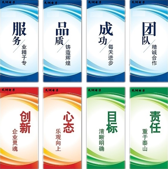 服务:业精于专。品质:铸造辉煌。成功:每天进步。团队:精诚合作。创新:企业灵魂。心态:乐观向上。目标:清晰明确。责任:重于泰山。