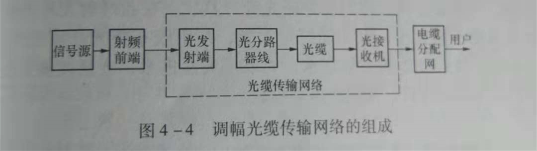 光缆传输网络是利用光纤作为传输媒体,以一定波长的激光为有线电视信号的载体。调幅光缆传输网络由光发送机、光分路器、光缆、活动接头、熔接点和光接收机组成,如图4-4所示。在前端将所传输的电视信号对光信号进行强度调制,即用所传输的电视信号来改变光信号的强度,在接收端再把电视信号解调出来。光发射机的射频输入电平一般要求在75BμV以上,因此,射频前端的输出电平可以直接驱动光发射机。如果射频前端的输出电平经过分支分配后不足以驱动光发送机,就需要在光发送机之前加接前馈放大器。
